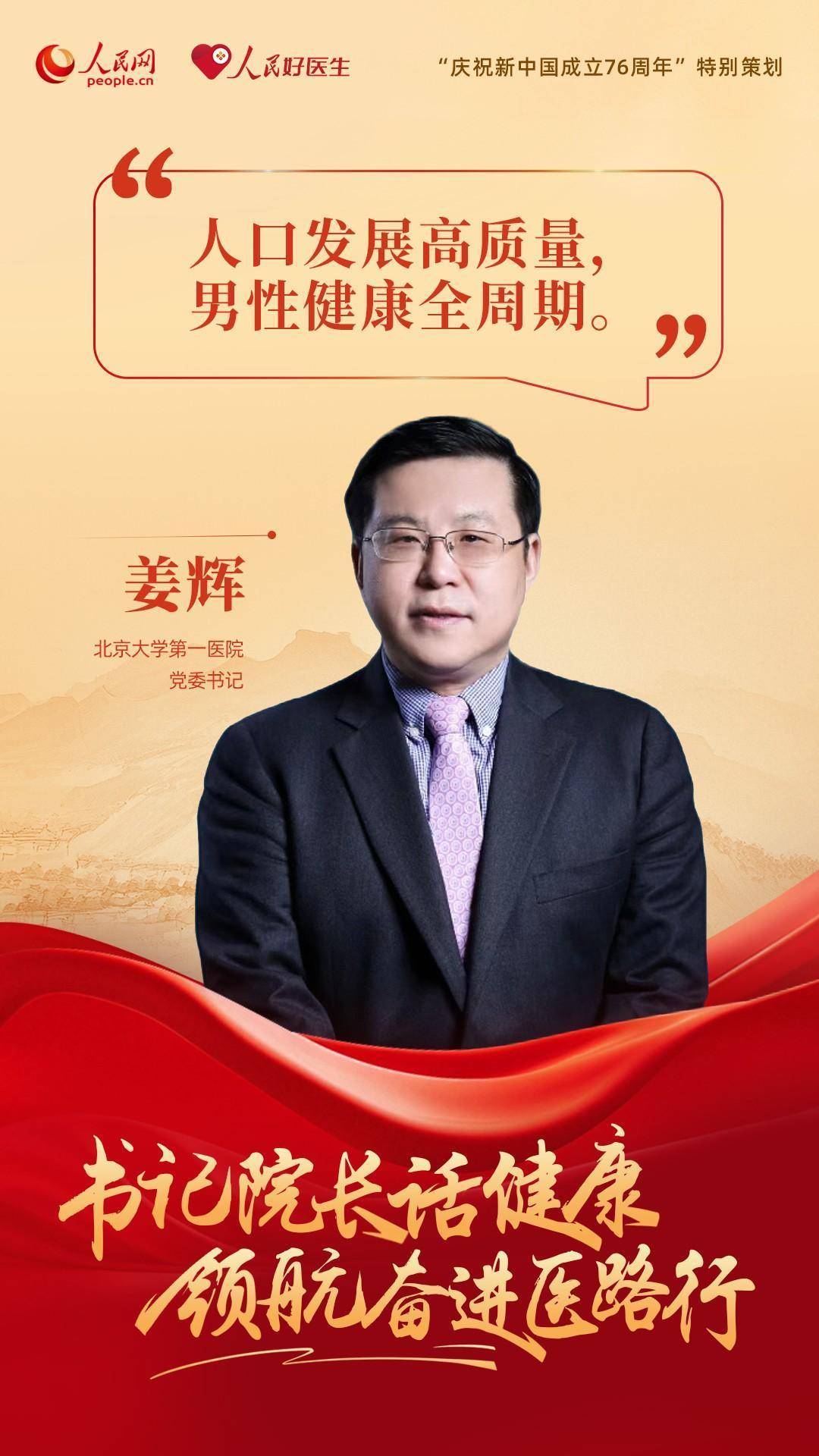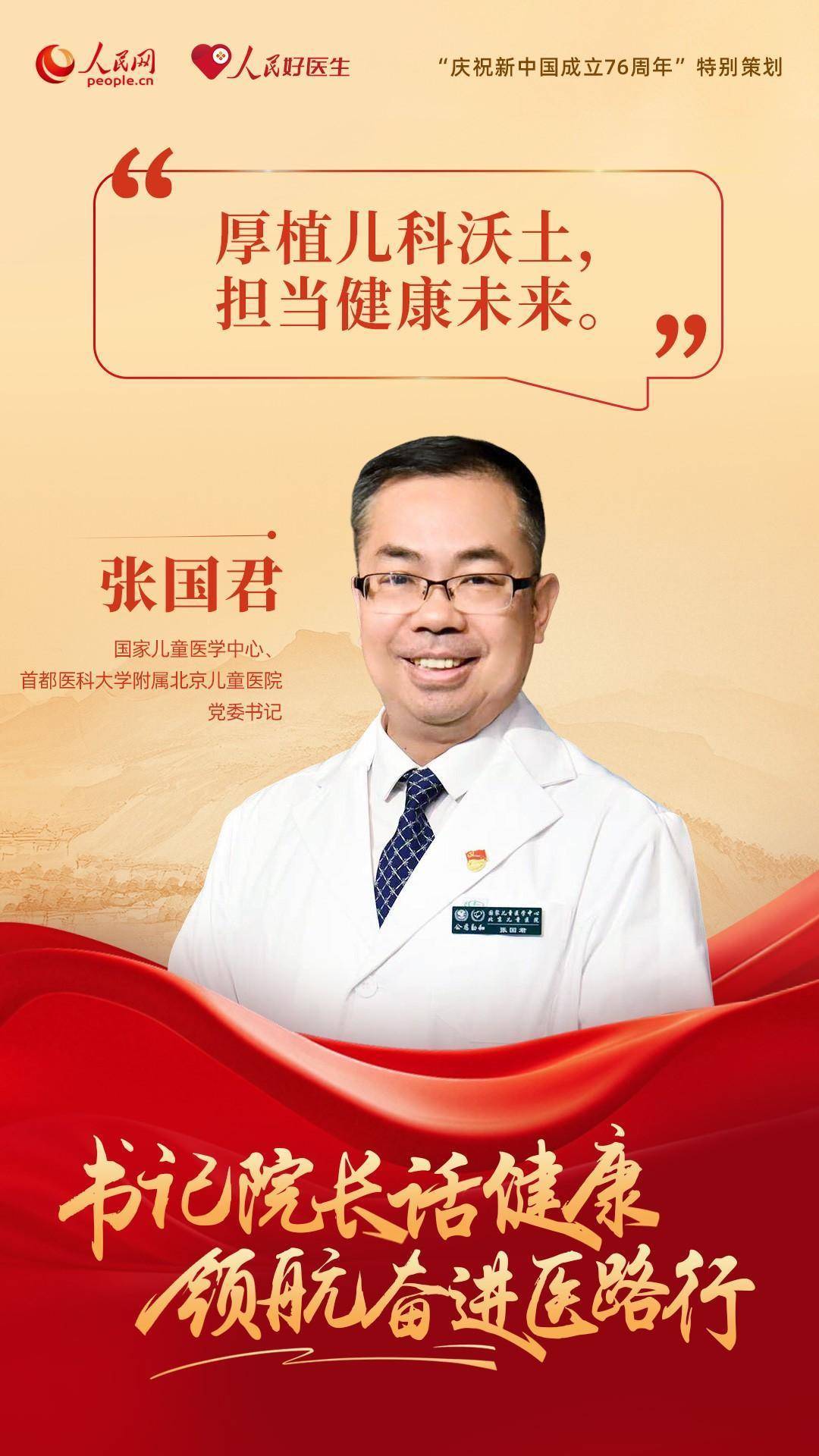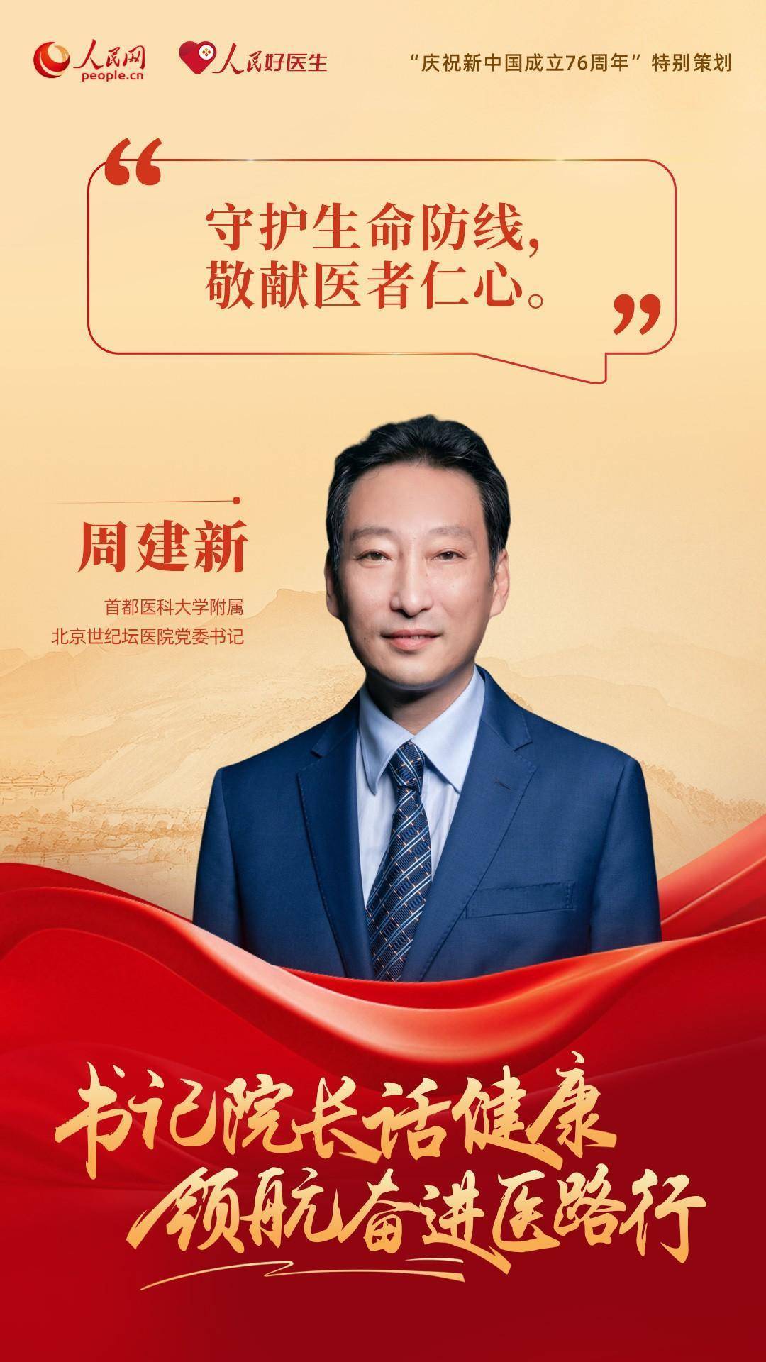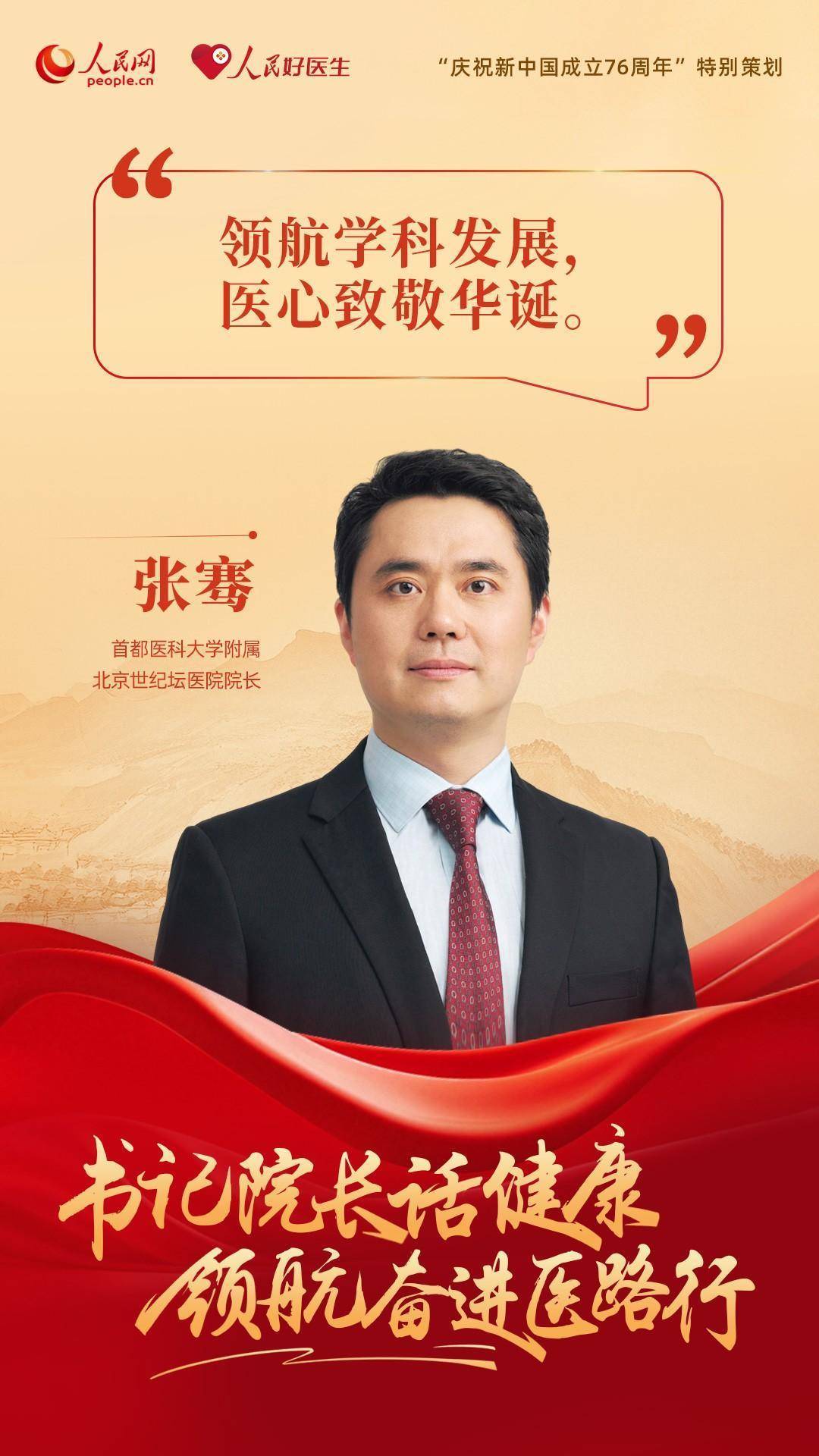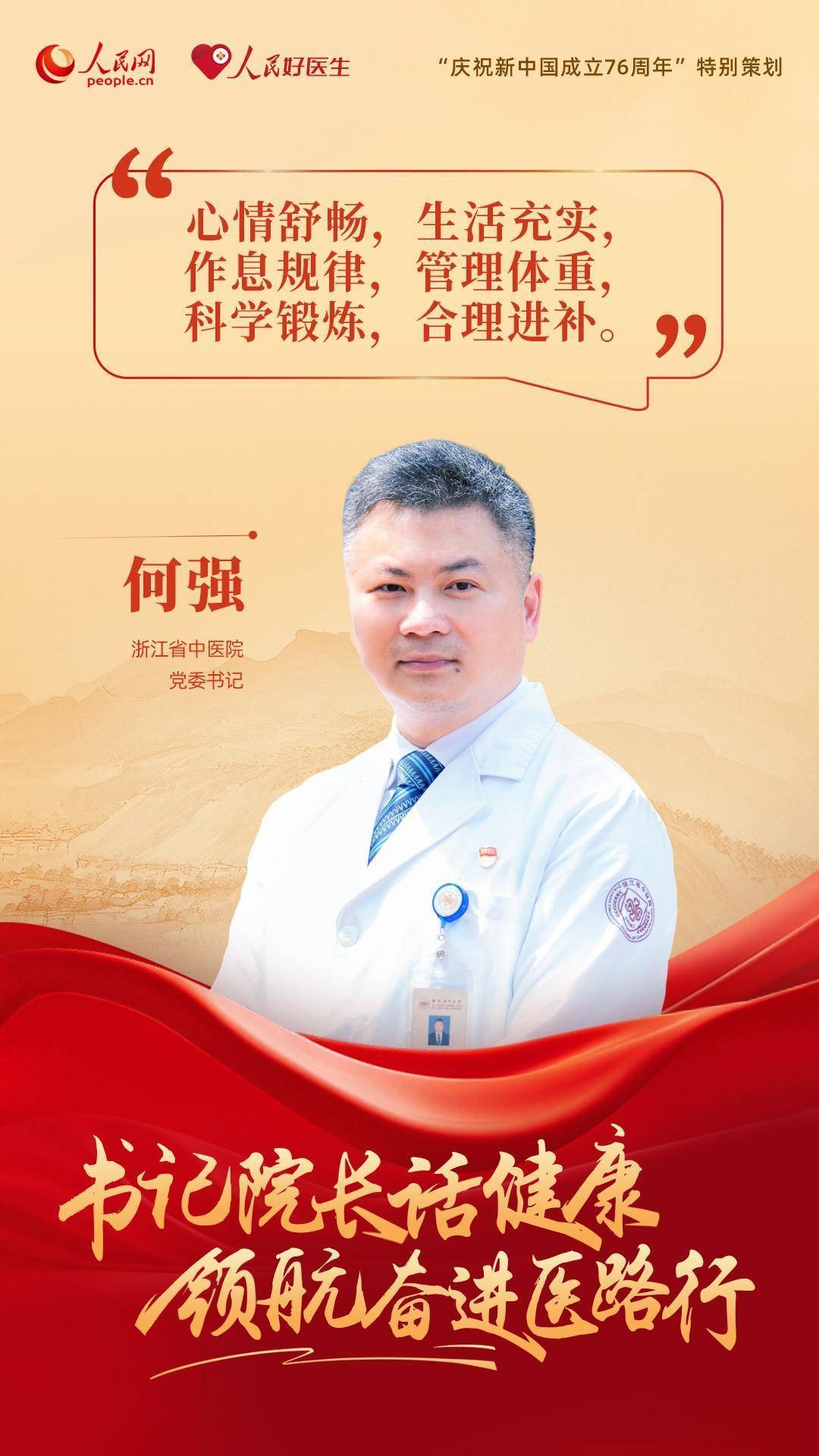 编者按:为了庆祝新中国成立76周年,人民网、人民好医生客户端特别推出“书记院长话健康 领航奋进医路行”策划,邀请18位全国公立三甲医院党委书记与院长分享“医路”前行中的医者初心与健康心得。