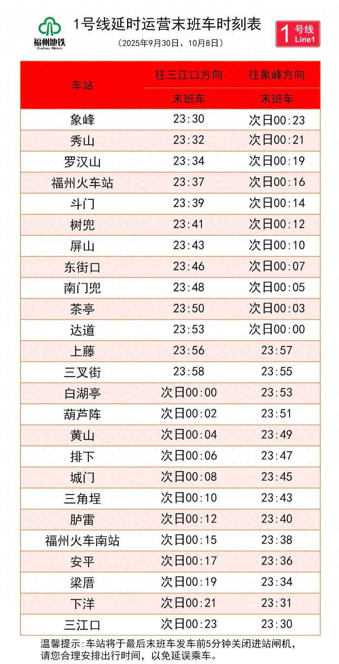 9月30日、10月8日福州地铁线网各线路运营末班车延至23:30,各线路末班车于23:30由线路两端车站始发。滨海快线延长运营期间仅开行普通列车。